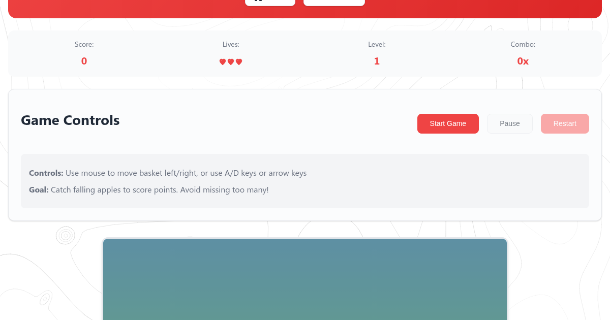 The Catch the Apple on FunnyFunHouse is completely free, runs entirely in your browser, and requires no downloads or sign-ups. Fun gravity-based arcade game - catch falling apples while avoiding bombs. Features power-ups, combos, and dynamic weather effects
