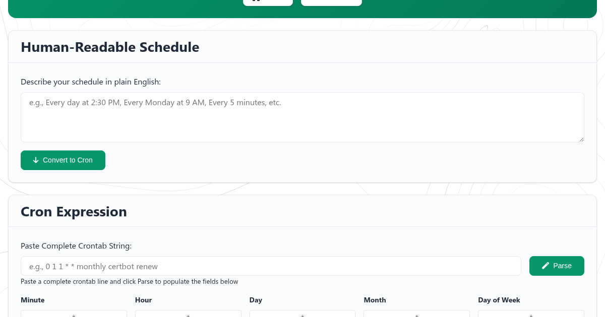 - Visual builder - Select minutes, hours, days, and months with simple controls