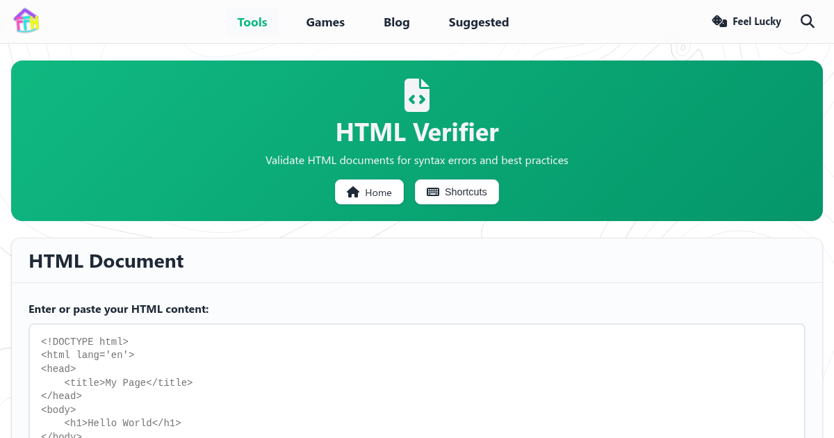 Writing valid HTML matters for accessibility, SEO, and cross-browser compatibility. The HTML Verifier analyzes your markup and reports issues like unclosed tags, missing attributes, deprecated elements, and nesting errors. Paste your code, click verify, and get a clear list of problems to fix.