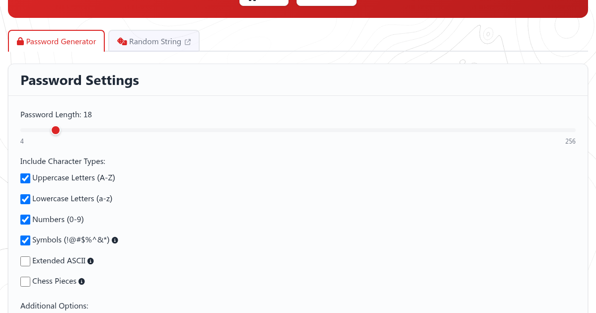 - Character types - Toggle uppercase, lowercase, numbers, and special characters